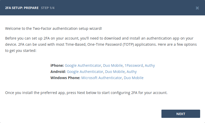 On the first step, we offer a list of popular authentication apps Bugsee can work with. In fact, Bugsee is able to work with any auth app that supports OTP. If you already have such app installed, you may skip this step.