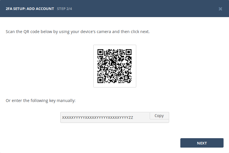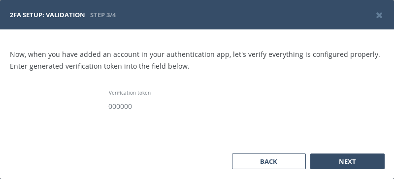 If you have properly configured your authentication application and verification was passed successfully, 2FA will be enabled for your account and you will be provided with backup codes. Please, store them somewhere to later obtain access to your account if you will not be able to access your authentication application anymore.