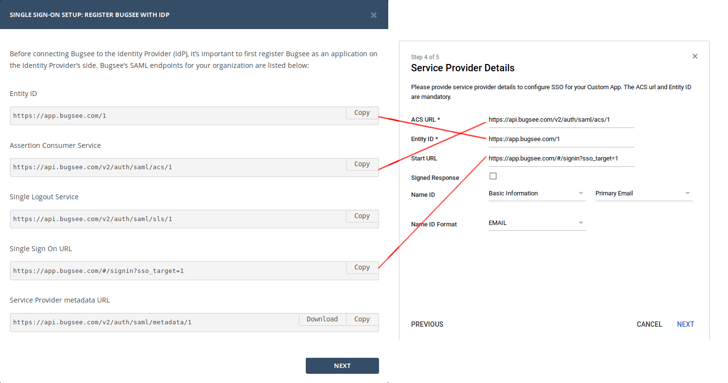 Now, on "Service Provider Details" step, you need to fill information available in "SSO setup" wizard in Bugsee. Please, follow the instructions shown in the screenshot below.