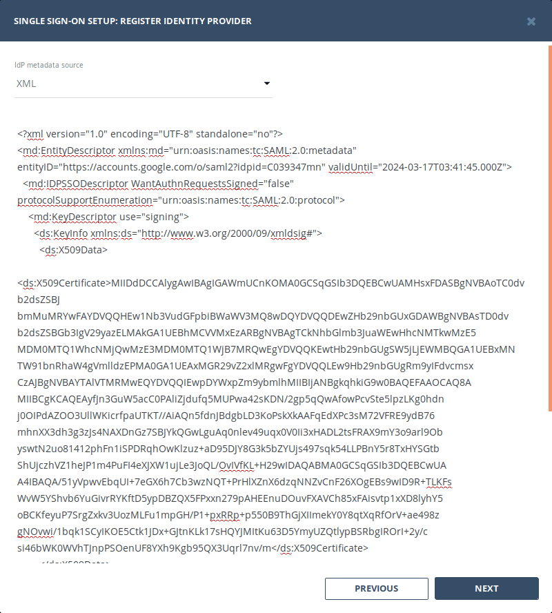 Now, remember the IdP metadata file you've downloaded. Open it, copy its contents. On the second step in "SSO setup" wizard in Bugsee dashboard select "XML" as Idp metadata source and paste the copied contents.